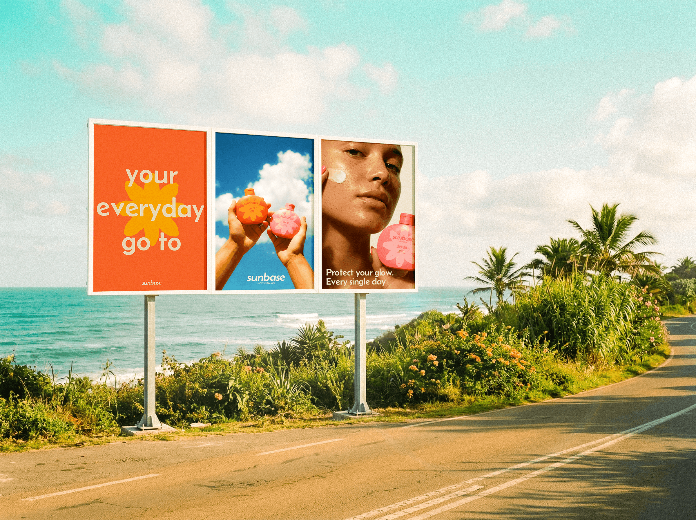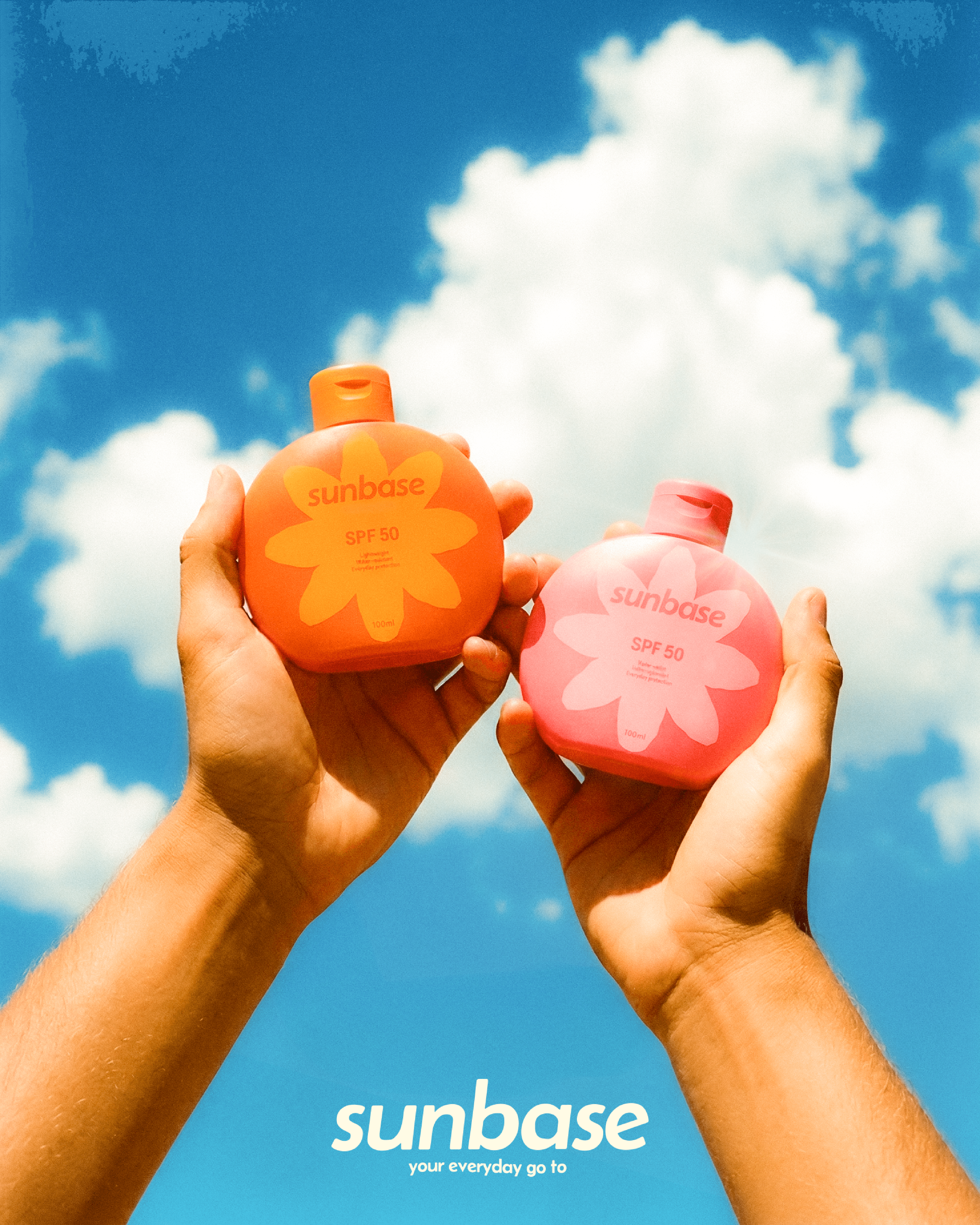 Sunbase est une marque de crème solaire de tous les jours, le branding très coloré et moderne pour attirer une clientèle jeune soucieuse de leur peau.